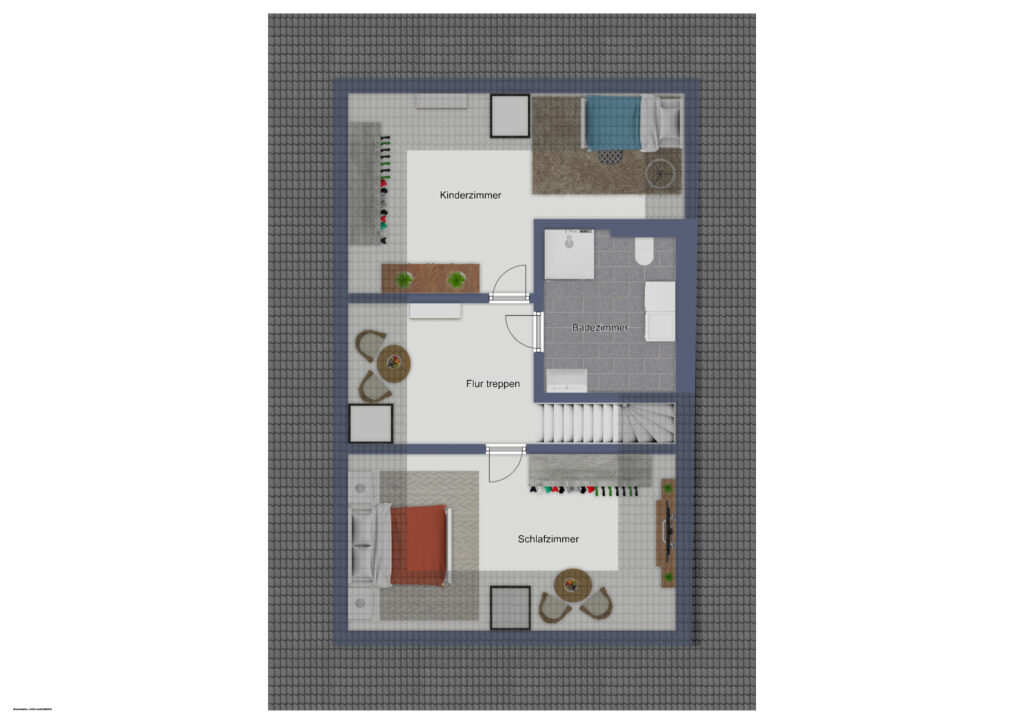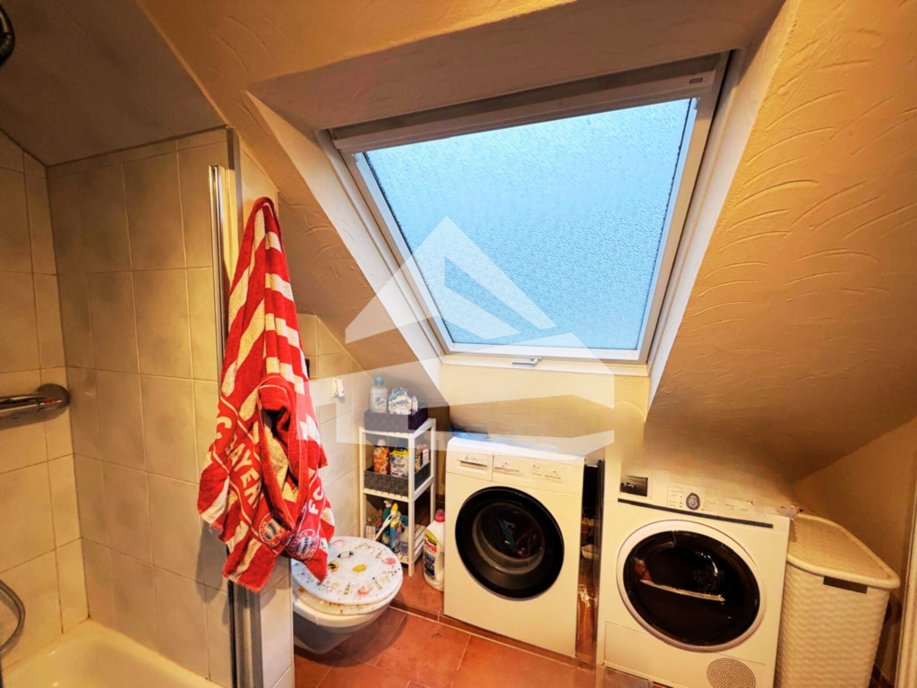 Im Obergeschoss sind weitere Schlafzimmer mit elektrischen Dachfenstern, Verdunklungsfunktion und Fliegennetzen vorhanden. Ein Bad mit Waschmaschinenanschluss sowie ein heller Flur ergänzen den Bereich.